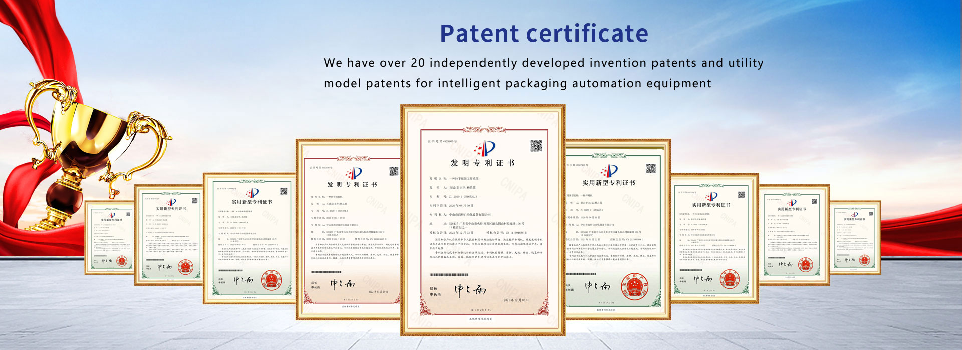 The company currently has a professional R&D and design senior engineering technology team in the fields of machinery, electricity, hydraulics, optics, etc. It has a group of skilled and experienced equipment assembly, debugging, and service technicians, and has more than 20 independently developed invention patents and utility model patents for intelligent packaging automation equipment.